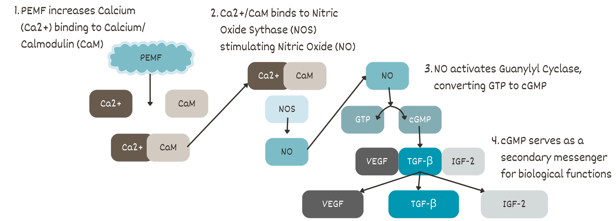 This diagram explains the proposed cellular mechanism of how PEMF therapy may work in the body. It shows how electromagnetic signals may influence calcium signaling, nitric oxide release, and cellular communication pathways that are involved in blood flow, tissue repair, and immune response. Importantly, this is a biological model, not a guarantee of clinical outcome.